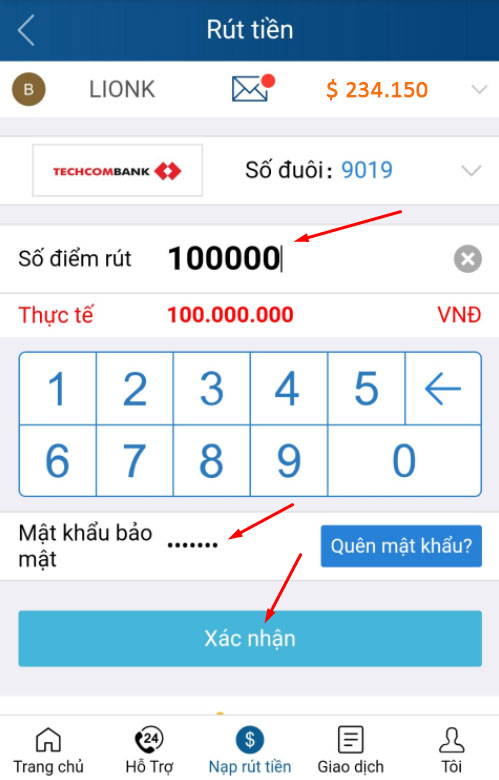Bước 2: Nhập số điểm muốn rút, sau đó nhập mật khẩu rút tiền và nhấn “Xác nhận”.